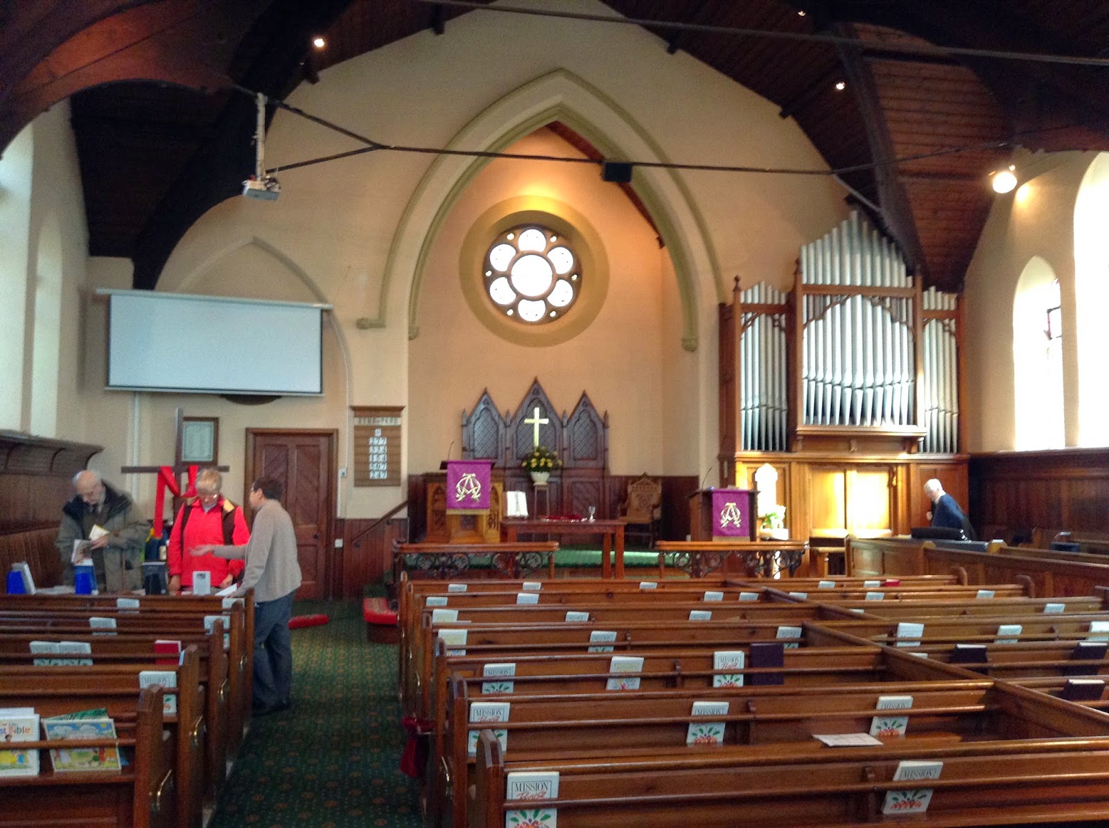 The transition service started in the old church, and then there was a procession of congregation and some official and somewhat symbolic accoutrements (a wee hand-held font, candles, bible that dates from the construction of the older church, chalice, some banners, some sheet music) over the road to the new place. The rain, which has been falling continuously since the start of November (apart from one cold, sunny day when the roads were covered in ice) stopped for the event. Methodists must sing at length about everything, so there was even a specially composed hymn with the requisite too-many verses detailing the adventure.